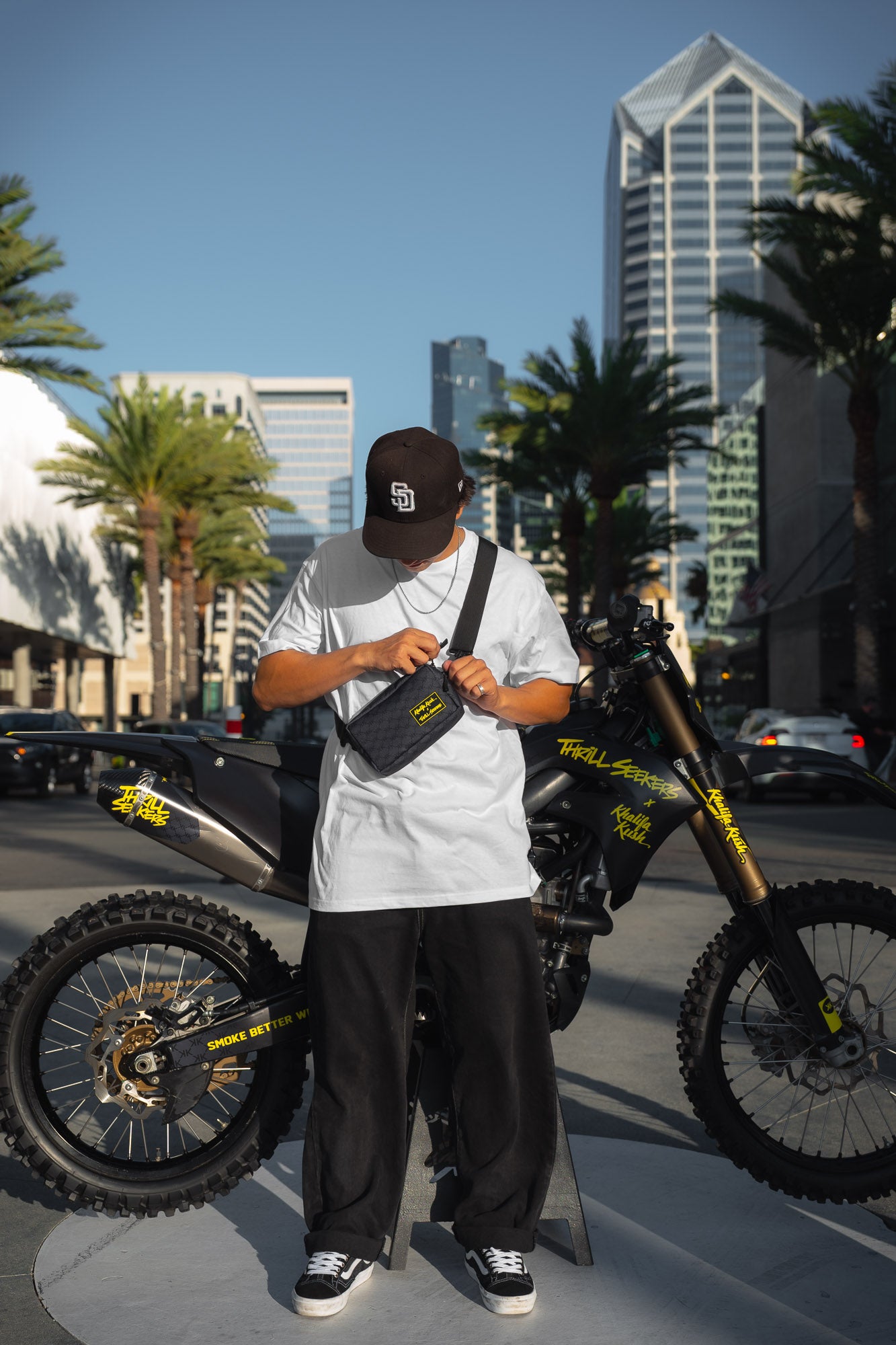 An exclusive collaboration between Khalifa Kush x Thrill Seekers. The limited edition stash bag is a water resistant + smell resistant bag that comes complete with a body strap PLUS 4 velcro straps to easily mount on any bike handlebars for when you're on the go. It is constructed with a heavy duty 1000 denier Cordura® fabric and sealed with molded zippers on the external main zipper and the internal pouch pocket zipper, which also helps with the smell. This bag boasts a luxury look with solid quality.